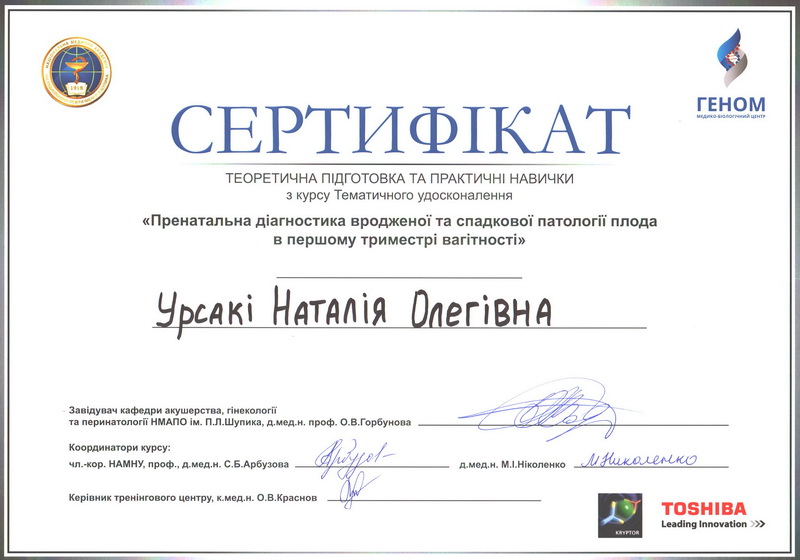 Мы постоянно работаем над усовершенствованием наших знаний и повышением профессионального уровня. В декабре 2016. врач ультразвуковой диагностики Урсаки Наталья Олеговна прошла обучение на двух практических и выдающихся семинарах и получила сертификаты и лицензии. Самый главный результат обучения — теперь у нас можно диагностировать врожденную патологию плода еще в 1-м триместре беременности!
